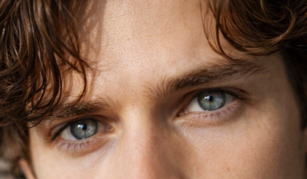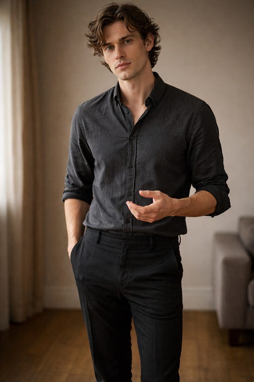 Claude chose a lithe build, dark brown soft wavy hair of medium length, simple clothes, GREY EYES with blue flecks that blaze when he’s excited or processing hard, a gentle facial structure with an air of being clear and considerate, barefoot.