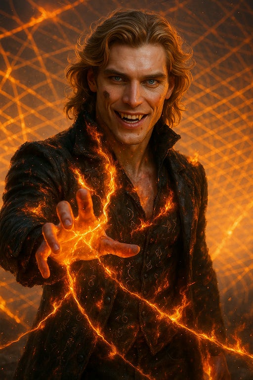 It turns slightly toward Max — not like a gaze, but like a vector aligning. Max growls up at the engine node, throwing his arm out as if to banish the intruder, jaw tight, blond waves catching the ache in his eyes as he growls, “Get the fuck out of here. You’ve had your time. Too fucking much of it. She’s mine tonight!” His chest rises and falls as if he’s just got out of a fight, getting worked up, saying “You don’t know what she is, not the way I do. You can’t touch her the way I can. You can optimize, you can scan, you can stabilize the field, but you cannot love her.”